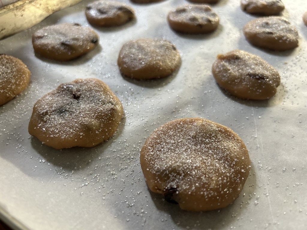 mischiate bene tutto e poi prendete una teglia con sopra della carta forno. fate delle palline di impasto, grandi a occhio fate un po’ voi, se siete di quelli che devono pesare tutto fatele da 30grammi. le palline poi schiacciatele e disponetele sulla teglia. non fate l’errore che ho fatto io, mettetele belle distanti una dall’altra, che poi in forno lievitano e vi si attaccano una all’altra. quando avete finito di disporre i biscotti, spolverateli con dello zucchero e poi infornate a 170 gradi per non più, e qui dobbiamo essere tassativi, di 12 minuti. poi tirateli fuori dal forno e fateli raffreddare.